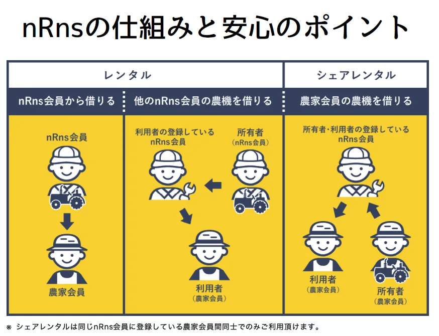 nRnsは「必要な時に借りる」「使わない時は貸す」という新しい選択肢を提供し、地域の農機を循環させることで持続可能な農業経営を支える仕組みです。